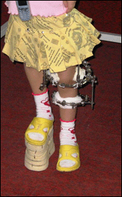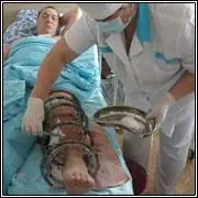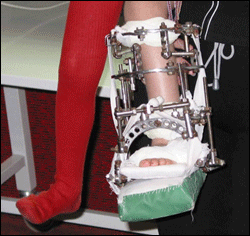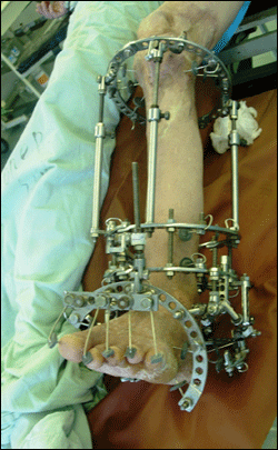 External fixation was first developed in Kurgan, Russia, more than 50 years ago. "Doctors were left to treat people with injuries with not much technology," Disabato said. "They had to figure out how to repair and stabilize a bone fracture." The solution was external fixation, which is based on a wheel and spoke concept. Steel rings circle the injured bone or joint, and thin metal rods run across the diameter of the ring, trough the patient's limb. In the wheel analogy, the rings are the tire, the rods are the spokes, and the bone is the hub through which all the rods intersect.